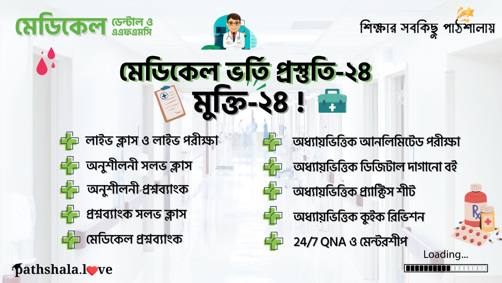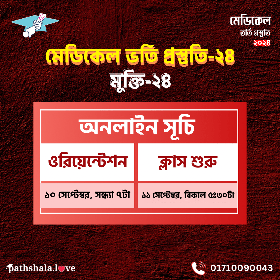মেডিকেল ভর্তি প্রস্তুতি (মুক্তি-২৪) এর ক্লাসগুলো মুল বই এর গুরুত্বপূর্ণ টপিক ও মেডিকেল প্রশ্নব্যাংক বিশ্লেষণ করে অনুষ্ঠিত হবে । মোট ৪৫ টি লাইভ ক্লাসের মাধ্যমে মেডিকেল ভর্তি পরীক্ষার সম্পূর্ণ কন্সেপ্ট বুঝিয়ে দেয়া হবে এবং ৪৫ টি লাইভ পরীক্ষার মাধ্যমে শিক্ষার্থীরা নিজেদের প্রস্তুতি যাচাই করতে পারবে। পাশাপাশি সেন্ট্রাল মেরিট লিস্টের মাধ্যমে নিজের প্রস্তুতির ম্যাপিং করতে পারবে