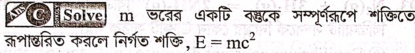 m ভরের একটি বস্তুকে সম্পূর্ণরূপে শক্তিতে রূপান্তরিত করলে কি পরিমাণ শক্তি নির্গত হবে ? আলোর বেগ = c