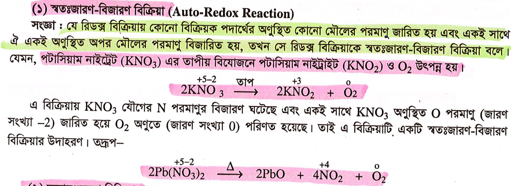☼ একই পদার্থ কখনো জারক আবার কখনো বিজারক হাতে পারে না: কোনো একটি বিক্রিয়ায় একটি জারক দ্রব্য অপর একটি বিক্রিয়ায় বিজারক রূপে ব্যবহার করতে পারে ।
