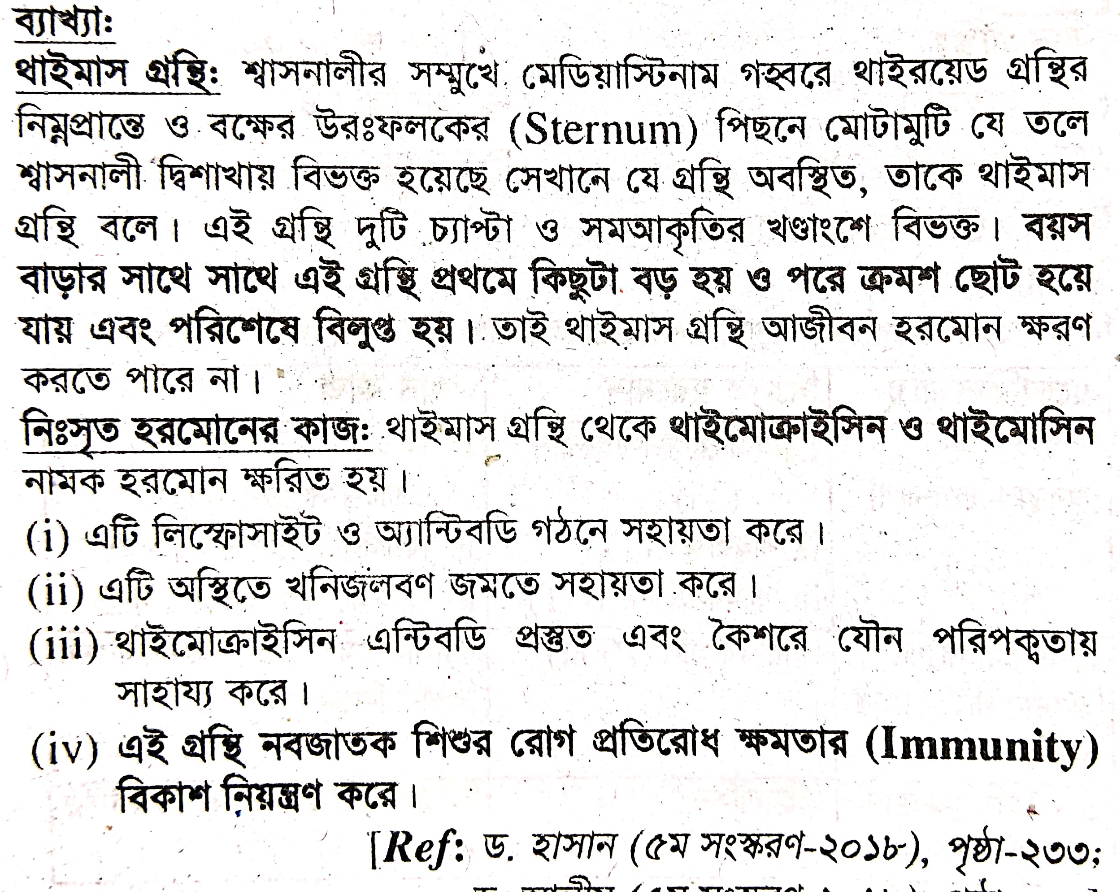 (iv) এই গ্রন্থি নবজাতক শিশুর রোগ প্রতিরোধ ক্ষমতার (Immunity) বিকাশ নিয়ন্ত্রণ করে।